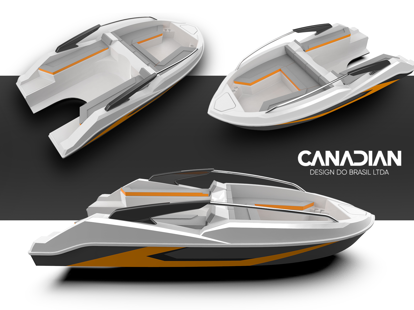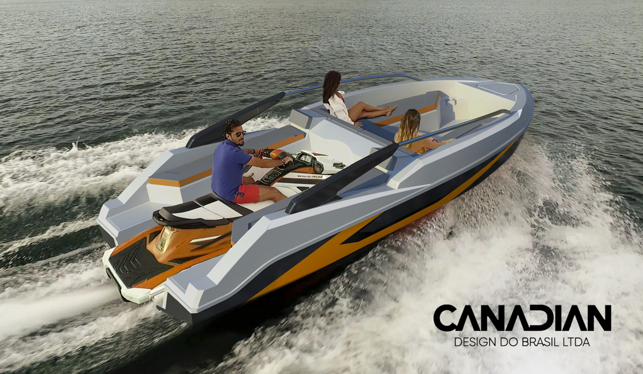 Embarcação que usa propulsão do seu jet, proporcionando o aumento de capacidade de passageiros, e que pode ser transportado juntamente com sua moto aquática, em um única carreta.